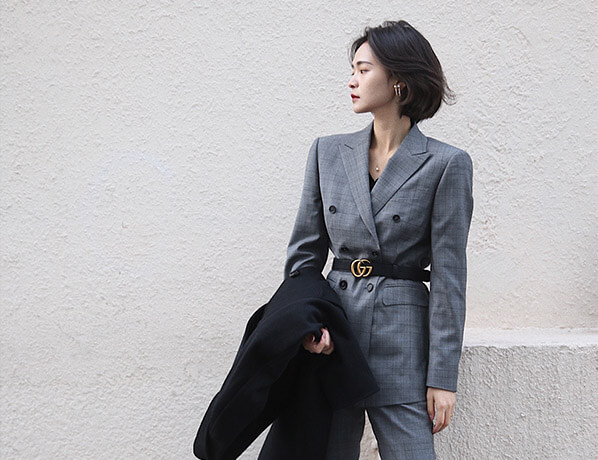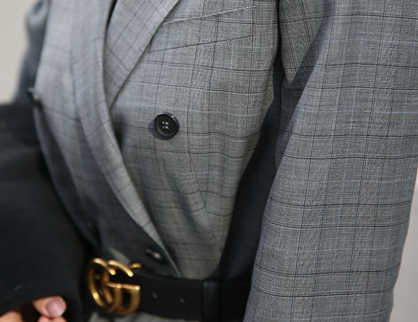 女士淺灰色網(wǎng)格雙排扣同款西服定制